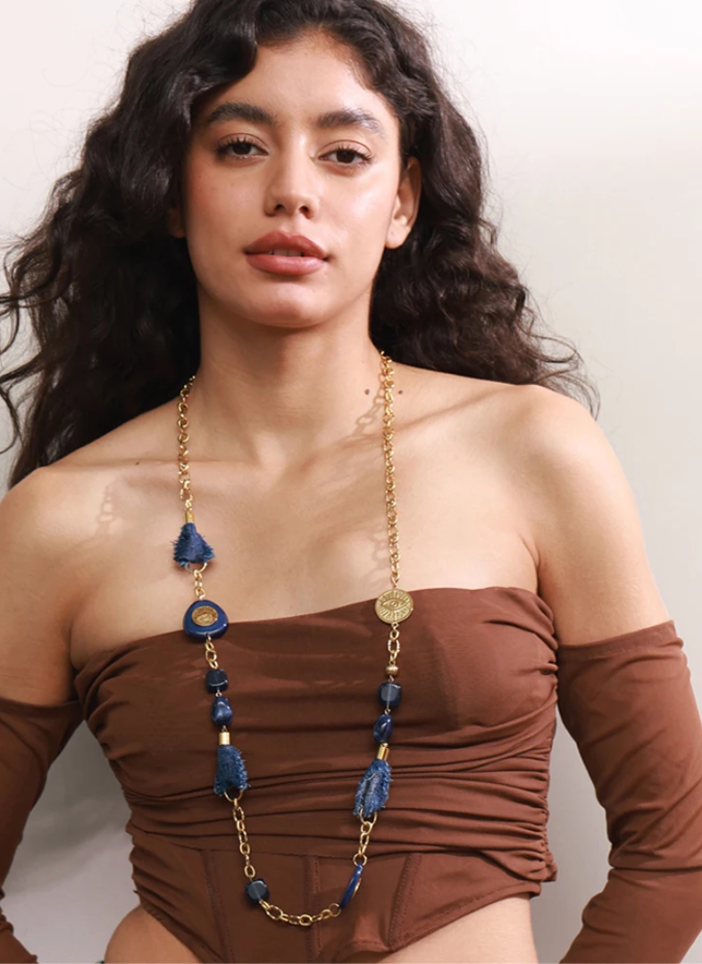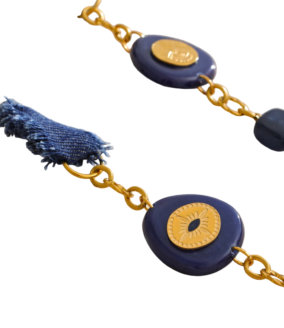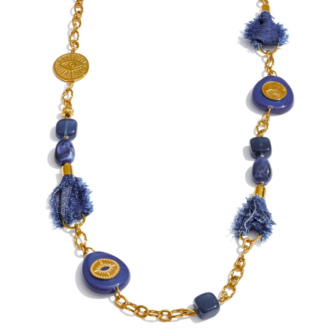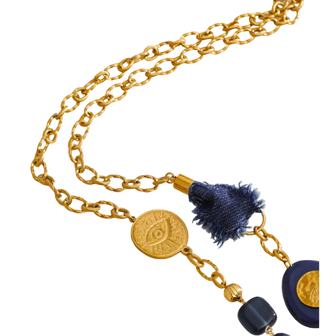 Elevate your look with our Chic and Unique Long Statement Necklace! This striking piece features an eclectic mix of elements, including bold blue gemstone beads, gold-tone Evil Eye coin charms, and rustic denim tassel accents, all set on a durable gold chain.