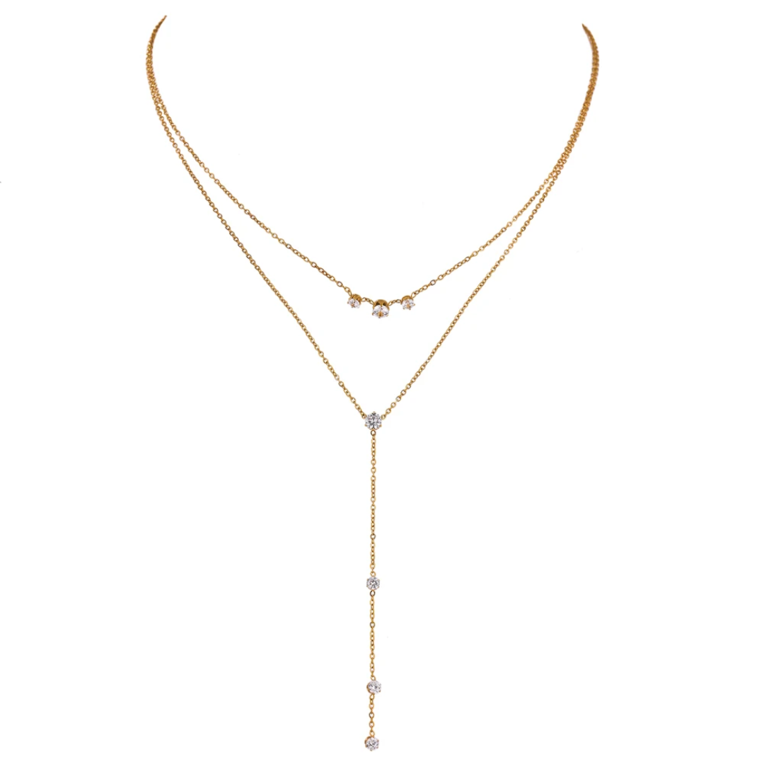 Achieve a look of sheer elegance with our Best-Selling and most Elegant Layered Y-Drop Necklace! This gold-tone, two-in-one piece features a delicate choker-length chain and a longer chain that forms a chic Y-shape, detailed with sparkling zircon stone stations.